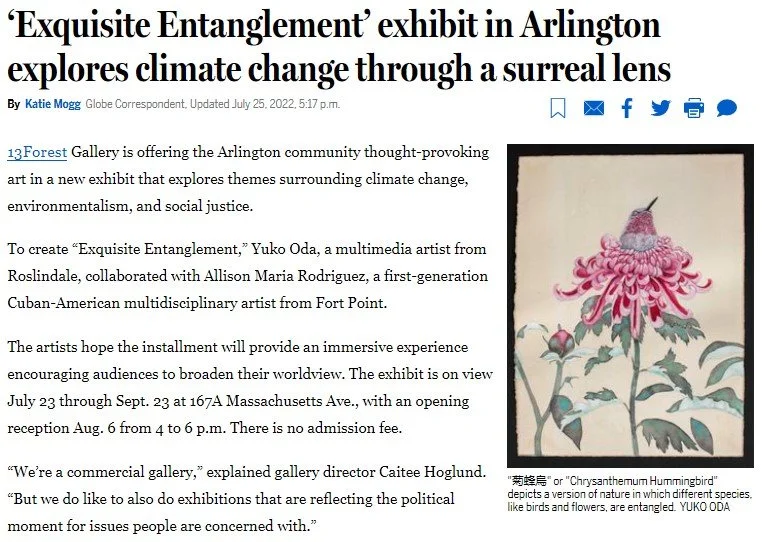 We were also grateful to have this exhibition recognized in a recent article in the Boston Globe. Correspondent Katie Mogg spoke to Rodriguez and Oda about their work as artists and activists. Rodriguez’ installation Once in a Lifetime began as a chance encounter with a beached blue whale in Costa Rica. “Rodriguez wants her work in ‘Exquisite Entanglement’ to serve as a memorial to the whale, but also to the piece of humanity that is lost when we live a lifestyle that kills fellow creatures on Earth. ‘The idea of this exquisite entanglement sort of plays on the tension that there is between everything being interconnected and how beautiful that is, but also how detrimental that has been to our planet,’ Rodriguez said. ‘We’ve been destroying and marching toward our own destruction.’”
