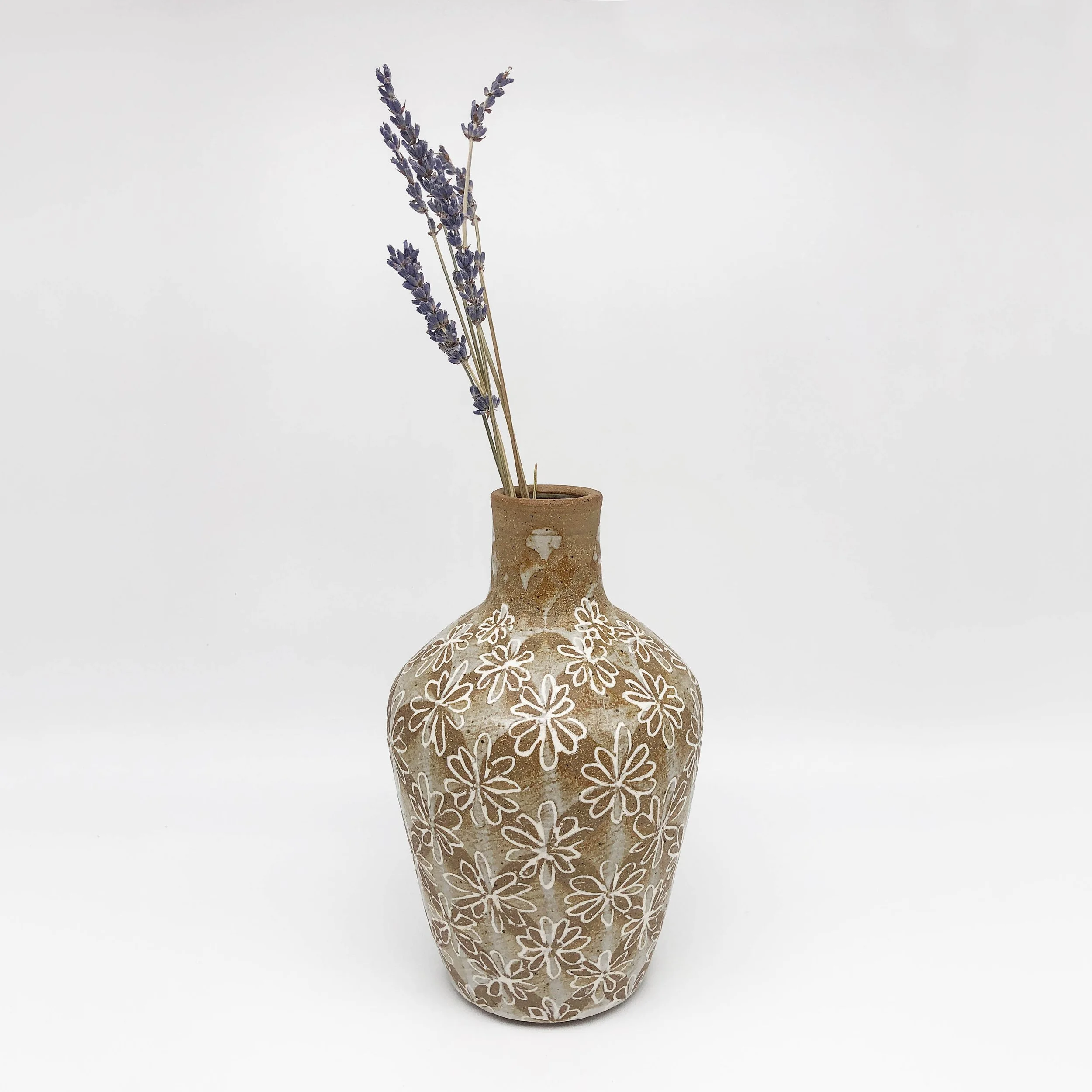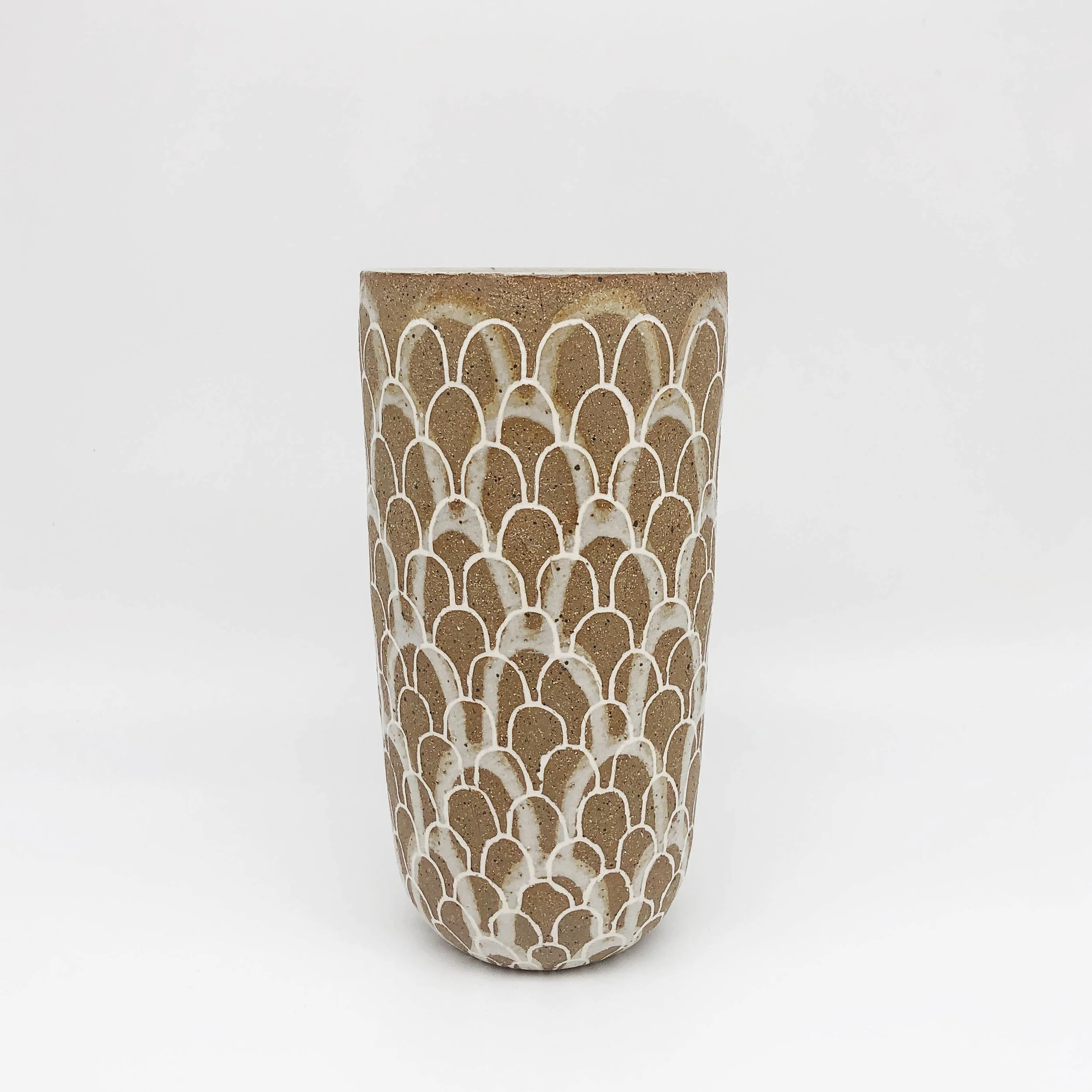 Boyer has been working in clay for over twenty years, making on the wheel and exploring a variety of handbuilding techniques. His inspirations typically come from highly repetitive patterns in nature and leverage his background in the sciences, looking to atomic structure and algorithmic thought processes as often as plowed fields or plant geometries. Although Boyer’s interests span a wide range of ceramic ware, sculpture and abstraction, his current focus has been surface design via carved inlay, often with additional patterned layers superimposed in the glazing process.