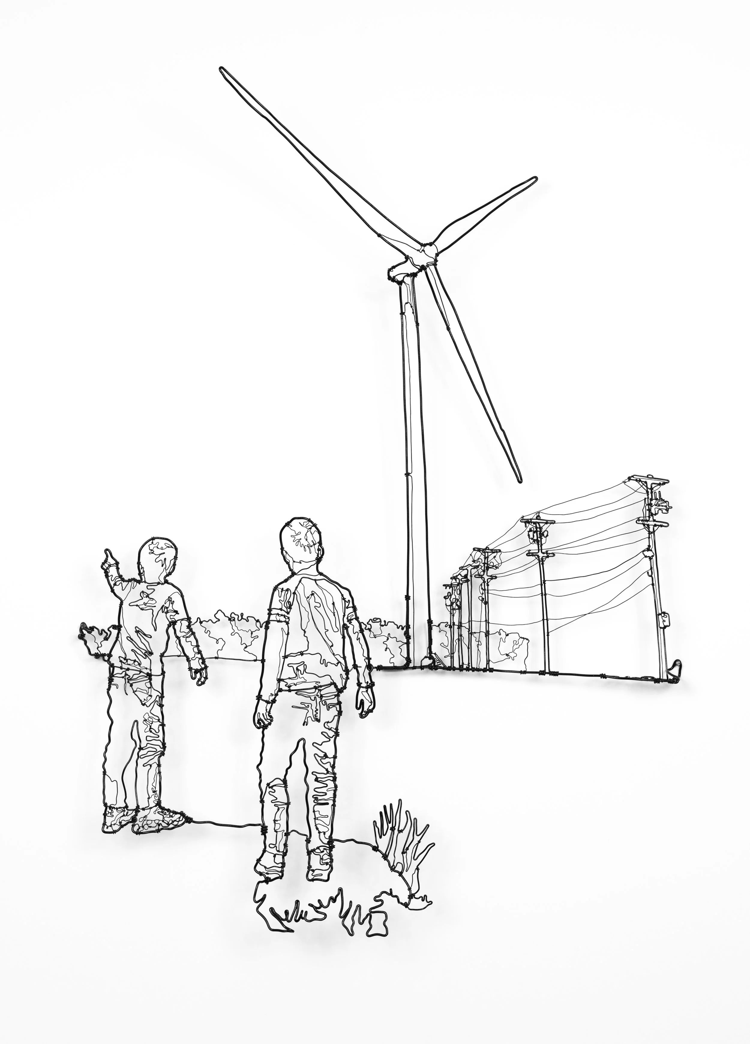 Roelle’s meticulous wire sculptures examine the delicate balance between personal time and family time. His first explicitly personal body of work, Roelle’s sculptures illustrate the range of activities that occupy a summer spent with his boys, from hunting through flea markets to days at the beach. Among these seemingly carefree scenes, Roelle includes images of his attempts to make time for himself and his relationship with his wife. For Roelle, parenting is a constant push-pull between the desire to spend time with his kids, the routines required of everyday existence, and his desire to follow his own artistic pursuits. His perpetually divided attention is a frequent source of personal dissonance.